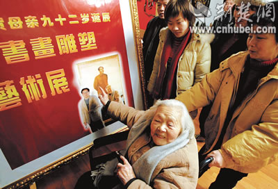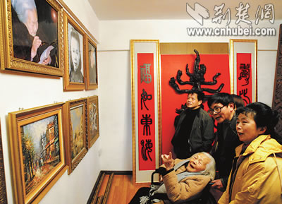 “這是特意為您準(zhǔn)備的生日禮物!”年過六旬的盧永瀚攙扶著92歲的母親,在根雕、油畫面前仔細(xì)講解。“這個根雕是壽字!”孫女插話說:“就是祝您長壽,活過100歲!”慧老太太邊看邊比劃著,樂得合不攏嘴,用濃重的江浙口音說:“好、好!”