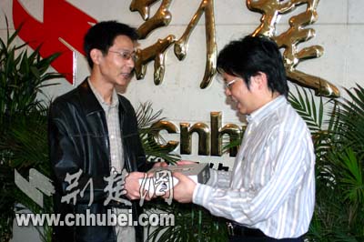 荊楚網(wǎng)副總編輯黃斌給從松滋趕來領(lǐng)獎的牟先生發(fā)獎