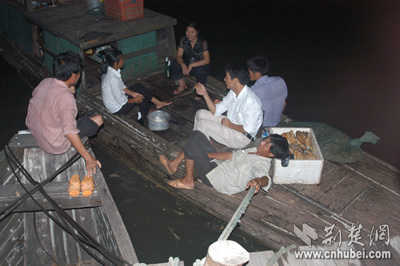 浮橋下面,江面的幾戶漁家把船靠上浮橋,聚在一起拉家常,享受著一天勞動的喜悅,也將自己一天捕獲的魚蝦擺上橋面,等待買家,聽著他們歡快的笑聲,知道他們該是有了一個(gè)好的收獲。