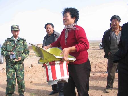 記者在搜索現(xiàn)場(chǎng)看到,從四面八方趕來(lái)的牧民群眾個(gè)個(gè)都有所獲!肮,人們常說(shuō)天上掉餡餅,這不應(yīng)驗(yàn)了?”牧民張金虎指著自己撿到的一堆殘骸,興奮地開(kāi)著玩笑。牧民烏云還向記者炫耀,她和丈夫?yàn)趿裉焯匾馄鹆藗(gè)大早,在家焚香默默祝愿神舟六號(hào)飛船試驗(yàn)成功,所以今天他們撿到的殘骸最多,能裝滿(mǎn)滿(mǎn)一車(chē)。