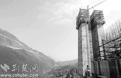 當(dāng)我們小心翼翼爬上馬水河大橋已修至47米高的橋墩時,當(dāng)我們戰(zhàn)戰(zhàn)兢兢走在野三河高懸百米的施工吊橋上時,當(dāng)我們驚嘆于四渡河幽深的峽谷時,當(dāng)我們走進(jìn)艱難掘進(jìn)的野三關(guān)隧道時,橋的險,隧的難,如一幅色調(diào)凝重而恢宏的畫卷,一一展現(xiàn)眼前。