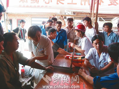 15日,參加武鋼工程建設的百余位農(nóng)民工兄弟,樂呵呵地接受了中國一冶電裝公司武鋼項目部為他們免費進行的體檢。浠水工程隊民工朱宗杰說:“這兩年來,社會各界對農(nóng)民工的關(guān)心很實在!