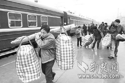 荊楚網(wǎng)消息(楚天金報)記者戴輝 實習生周靜、魯力 通訊員武交報道:昨日14時15分,由廣州開往襄樊的L328次列車徐徐停靠在武昌火車站第一站臺,這是今年鐵路部門開行的首趟民工專列。