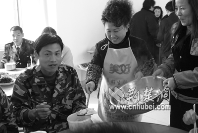 “小伙子,辛苦了,多吃點(diǎn),社區(qū)就是你們的家!”昨天中午,江岸區(qū)花橋街大江園社區(qū)的100多名外來農(nóng)民工成了社區(qū)的座上賓。社區(qū)群干自己出資,自己買菜下廚,做了12桌團(tuán)圓宴。