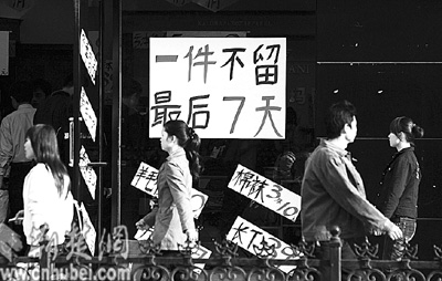 昨日,武漢市江漢路某品牌商店用碩大的“褲”字吸引行人購(gòu)買欲(圖一)。在市場(chǎng)競(jìng)爭(zhēng)激烈的今天,“臉面”設(shè)計(jì)成為商家費(fèi)勁腦筋追逐的重心,但也有一些商家長(zhǎng)期打著“大甩賣”的旗號(hào)欺騙消費(fèi)者,頗煞風(fēng)景(圖二)。記者 張鴻 攝