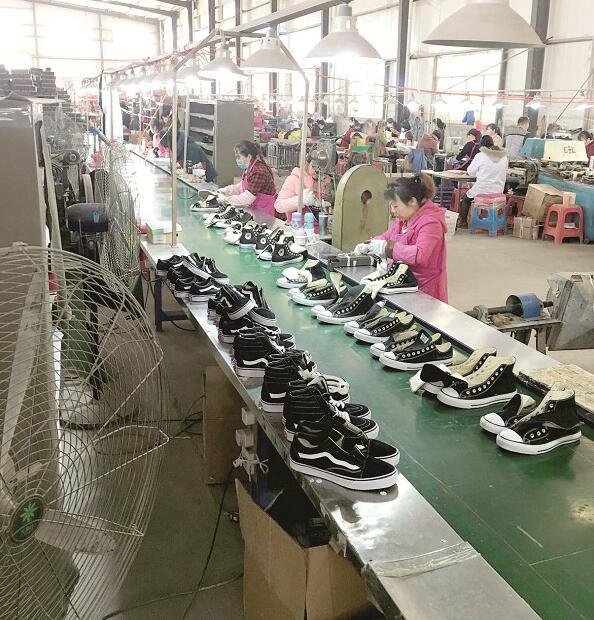 生產(chǎn)車間面積上千平方米,里面氣味刺鼻,數(shù)臺(tái)電風(fēng)扇正呼呼轉(zhuǎn)動(dòng),100多名工人十分忙碌:制作鞋底、印花、縫制鞋面、做鞋幫、固定鞋型、系鞋帶、裝盒……