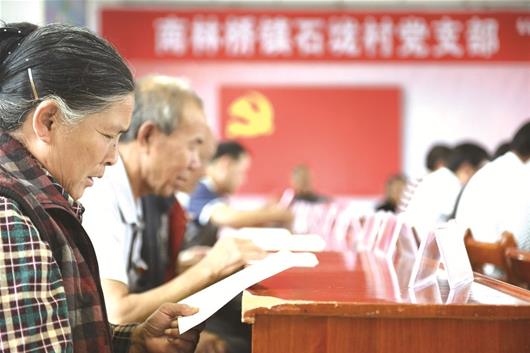 通山縣南林橋鎮(zhèn)石垅村黨支部開(kāi)展支部主題黨日活動(dòng),黨員共同誦讀黨章。