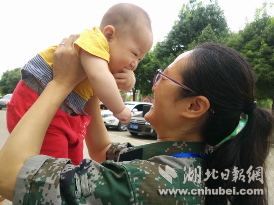 湖北日?qǐng)?bào)網(wǎng)訊(全媒體記者 張愛(ài)虎 通訊員 江開(kāi)群 秦修)6日上午8時(shí)30分,嘉魚(yú)縣陸溪鎮(zhèn)鎮(zhèn)長(zhǎng)路紅云,到縣防指辦理防汛物資報(bào)領(lǐng)手續(xù),忙完后下樓,正是9時(shí)10分,見(jiàn)到婆婆抱著5個(gè)多月的兒子蕗熙趕來(lái)。乘著采訪的間隙,一身戎裝、皮膚黧黑的路紅云抱著兒子逗玩。