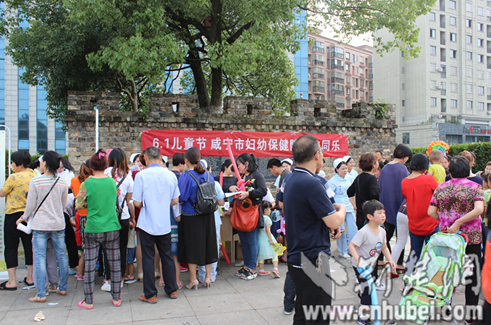 咸寧市婦幼保健院兒科醫(yī)護(hù)人員在咸寧市十六潭公園廣場上為孩子們義務(wù)體格檢查