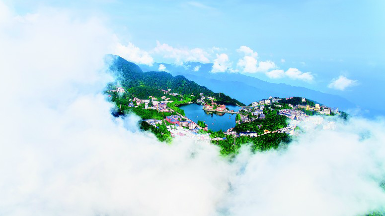 8月4日,空中鳥瞰通山縣九宮山國家級風景名勝區(qū),山頂?shù)脑浦泻ㄈ灰恍隆?/p>