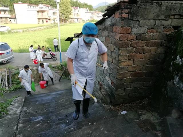 衛(wèi)生部門進(jìn)村灣對(duì)農(nóng)戶房前屋后進(jìn)行消殺,凈化環(huán)境。(胡劍芳攝)