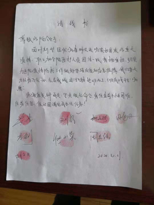 “葉書記,我們志愿加入抗擊新型冠狀病毒感染的肺炎防控工作中!”“葉書記,請讓我們上!”當(dāng)接到市防控指揮部命令,需要醫(yī)護(hù)人員增援,第二人民醫(yī)院院黨總支書記葉躍平同志在醫(yī)院微信群里發(fā)出了動員令,隨后,一封封蓋滿手印的請戰(zhàn)書遞到了他的桌上。
