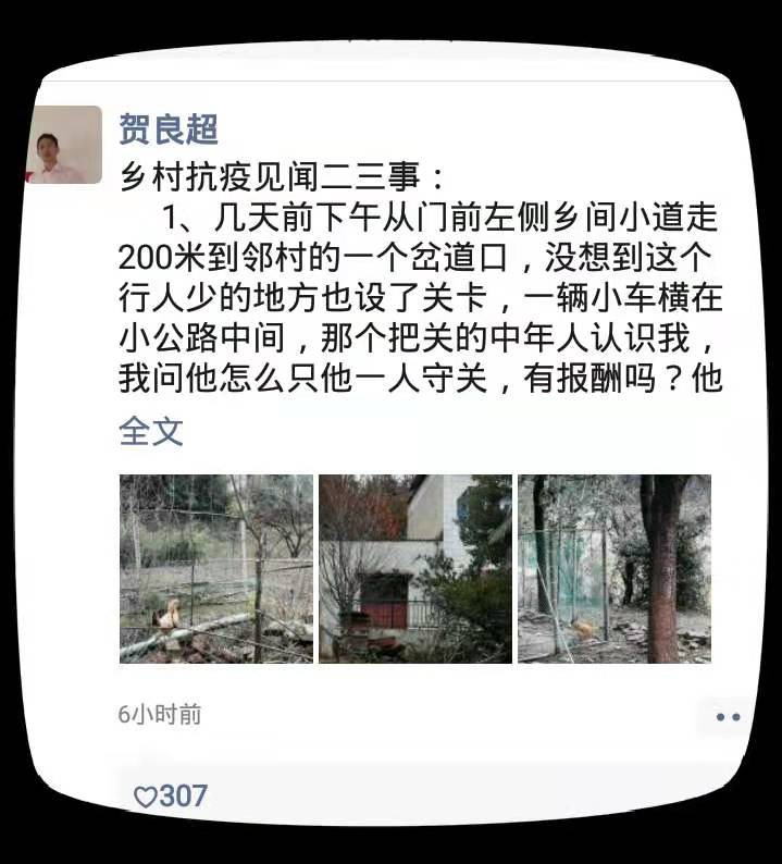 2月11日,赤壁市黃蓋湖鎮(zhèn)鐵山村一位從廣州返鄉(xiāng)村民賀良超在朋友圈里發(fā)了一條長(zhǎng)文,寫下抗疫期間,他在鐵山村的所見所聞,原文如下: