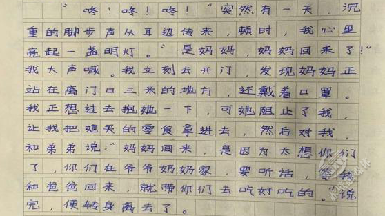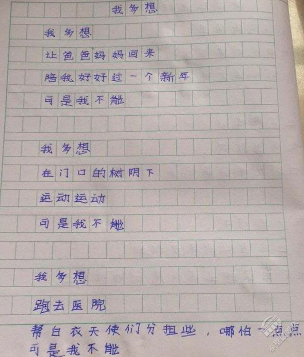 夫妻倆的大寶二寶,被托付給爺爺奶奶照料。多日不見父母,他偷偷寫下一首詩《我多想》:“我多想,讓爸爸媽媽回來,陪我好好過一個(gè)新年,可是我不能……我多想,跑去醫(yī)院,幫白衣天使分擔(dān)一些,哪怕一點(diǎn)點(diǎn),可是我不能……”字里行間,流溢出滿滿的思念。