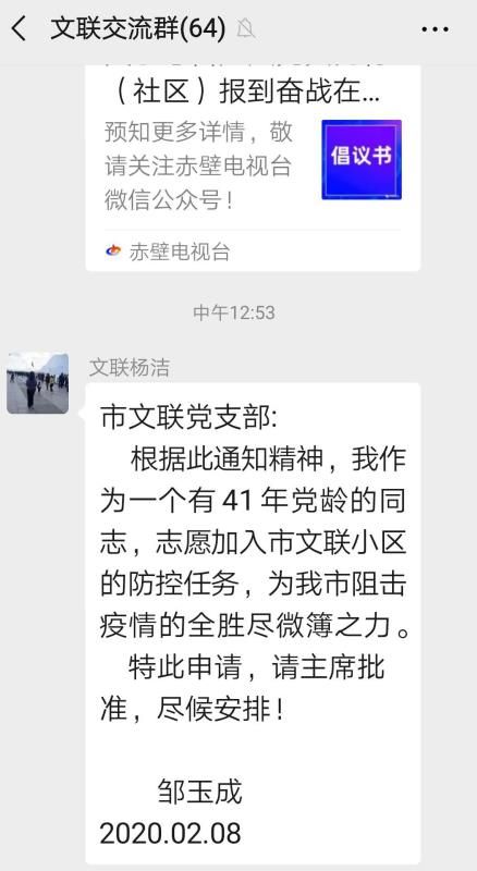 2月8日晚,他從媒體上看到,赤壁市委組織部發(fā)出倡議書,號(hào)召?gòu)V大黨員向村(社區(qū))報(bào)到,奮戰(zhàn)防疫一線。從字里行間,他感受到抗疫形勢(shì)的嚴(yán)峻,再次寫下請(qǐng)戰(zhàn)書。