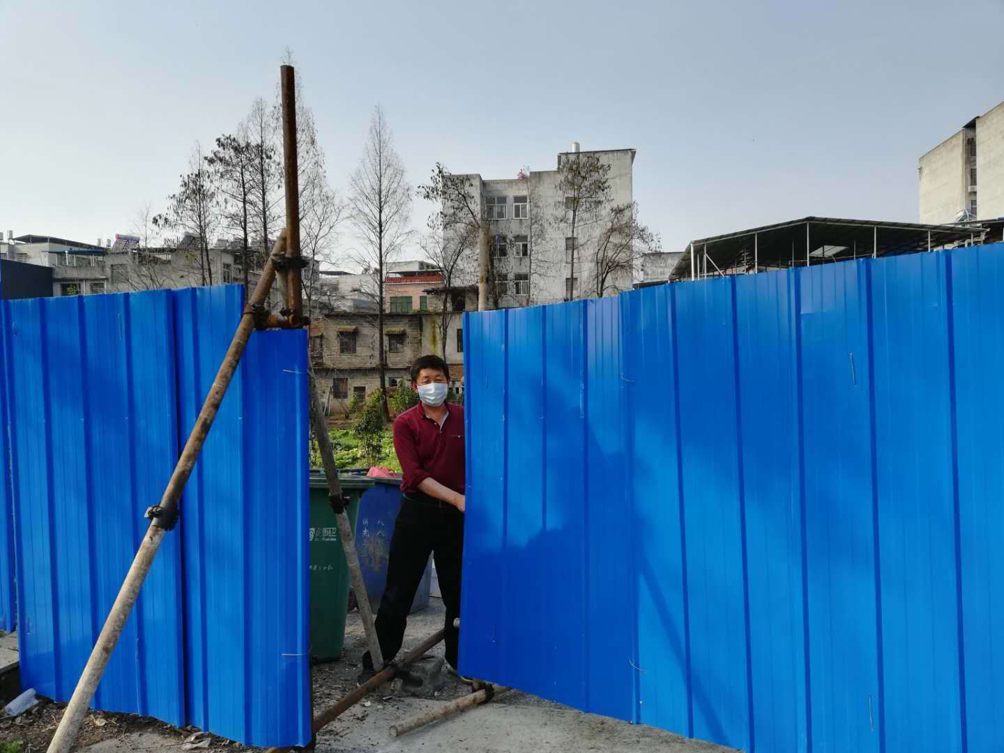 自臘月二十九日開(kāi)始,村干部們帶頭上,購(gòu)買(mǎi)了樹(shù)木、鐵皮,立樹(shù)樁,釘鐵皮墻。大道兩邊相向設(shè)置,從南門(mén)河四橋開(kāi)始,一直到城內(nèi)小區(qū)。到大年三十晚上,兩道藍(lán)色的“屏障”悄悄立起,它們“環(huán)著村、環(huán)著城”,成為斬?cái)嘁吣У摹爸旅徽小薄?/p>