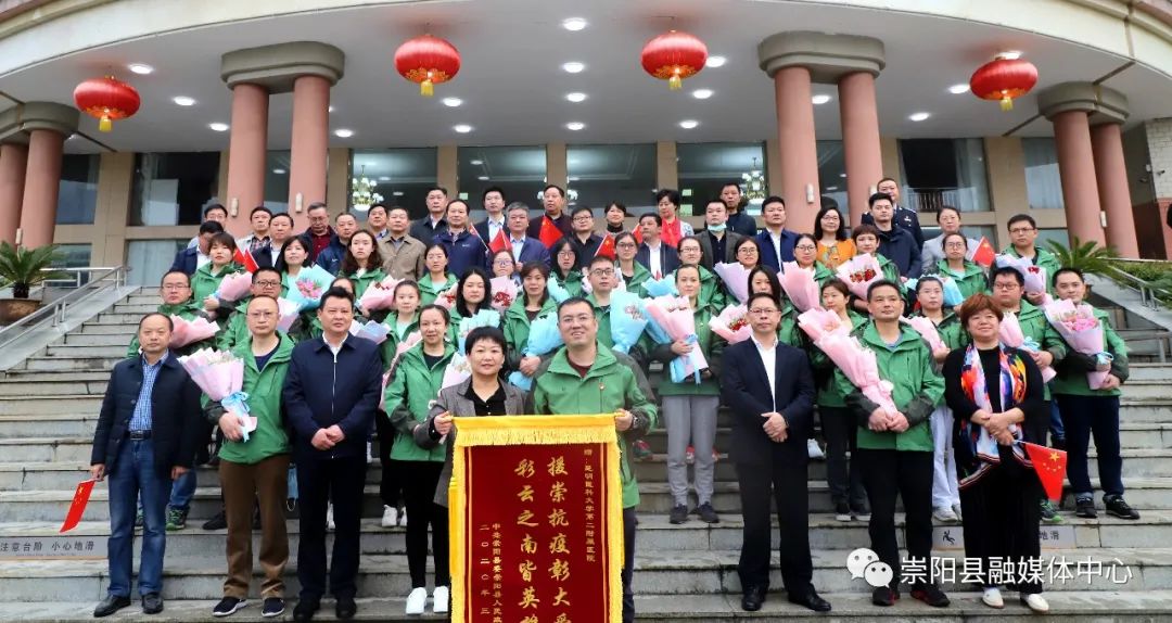 送別儀式上,杭鶯、鄭俊華等縣領(lǐng)導(dǎo)為全體云南醫(yī)療隊隊員獻上鮮花。隨后,杭鶯向云南醫(yī)療隊隊長董昭興頒授印有“援崇抗疫彰大愛 彩云之南皆英雄”錦旗并合影留念。