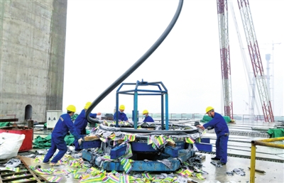 4月20日上午9時許,赤壁江畔,煙雨朦朧。隨著現(xiàn)場指揮人員一聲令下,塔吊吊鉤緩緩升空,一條長96.492米,重達6.40噸的“長龍”蜿蜒騰空而起,一端“穿針引線”地安裝在塔端1號索道管內(nèi)再脫空展索。