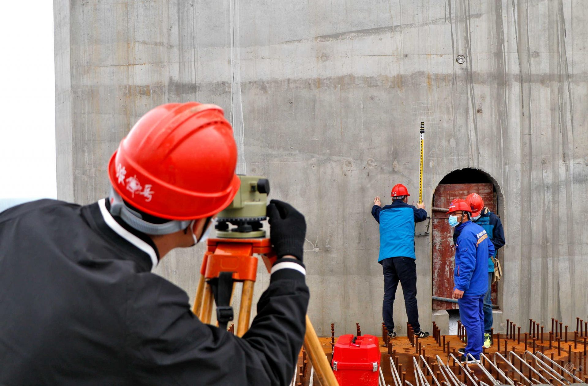 4月21日,赤壁長江公路大橋項目建設(shè)現(xiàn)場,技術(shù)人員為確保鋼梁準確吊裝,正在進行定位測量。