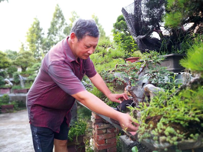 如今,越來越多的人慕名而來,有時孫勝望家中的盆景園來客絡(luò)繹不絕。他總是不厭其煩,來者不拒。樂意一道分享藝術(shù)的魅力。同時,他也致力于傳播和發(fā)揚(yáng)盆景藝術(shù),遇到虛心求教的,他孜孜不倦,耐心施教。去年通城有一個盆景制作班請他去講課傳授技藝,一連20多天,孫勝望風(fēng)雨無阻,手把手地“傳幫帶”,分文不取,令學(xué)員們欽佩不已。