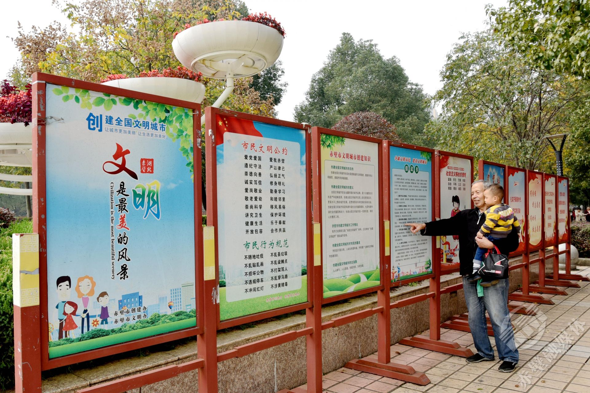 “今天帶孫子出來(lái)轉(zhuǎn)轉(zhuǎn),抬眼就看到這個(gè),正好教孫子認(rèn)認(rèn)字?!?0月29日,溜彎在人民廣場(chǎng)的羅爺爺指著文明創(chuàng)建宣傳展板開(kāi)心的對(duì)記者說(shuō)。