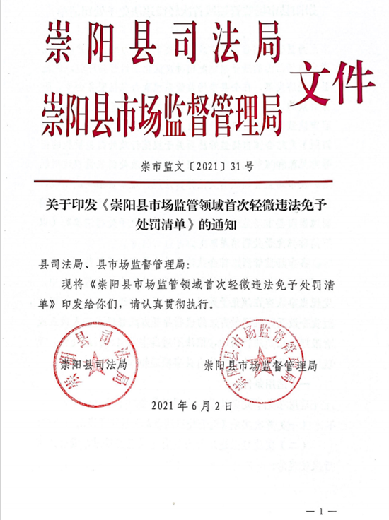 6月2日,崇陽(yáng)縣司法局、縣市場(chǎng)監(jiān)管局在廣泛征求意見的基礎(chǔ)上,印發(fā)了《崇陽(yáng)縣市場(chǎng)監(jiān)管領(lǐng)域首次輕微違法免予處罰清單》(2021年版)。