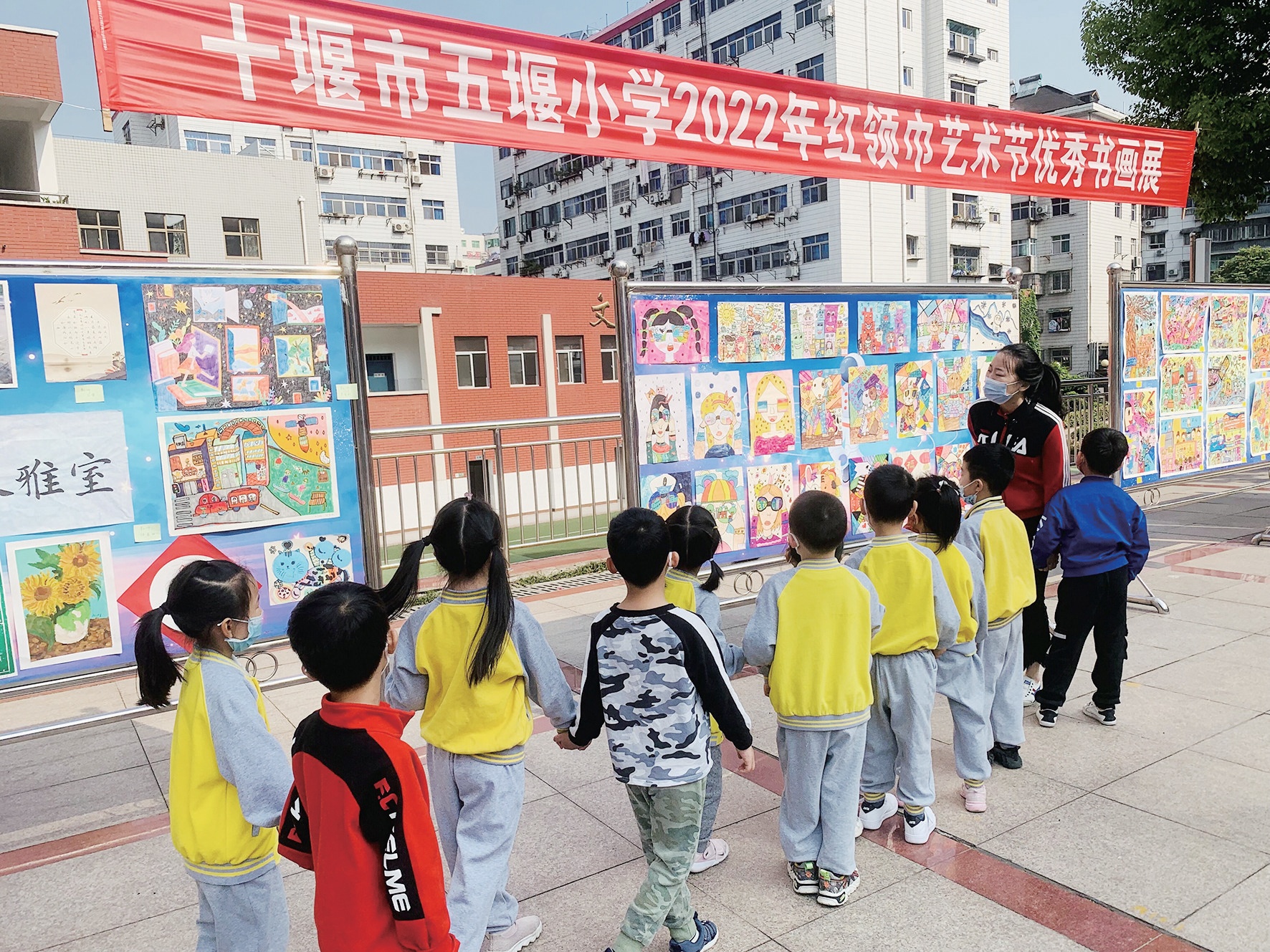 幼兒園大班孩子參觀(guān)小學(xué)校園。