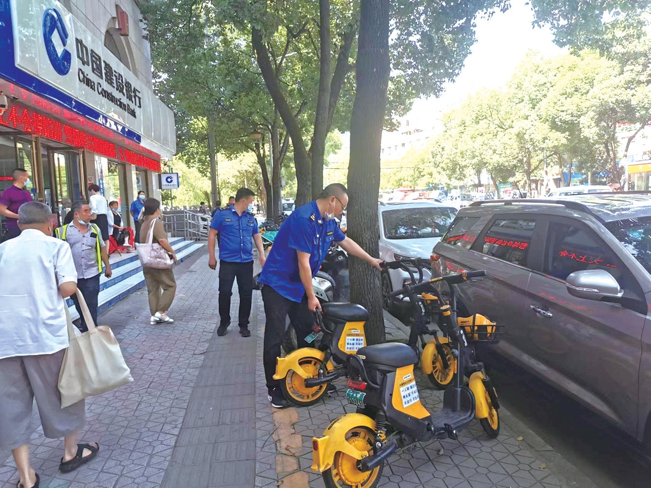 城管執(zhí)法人員整理漢江北路路段的共享單車。