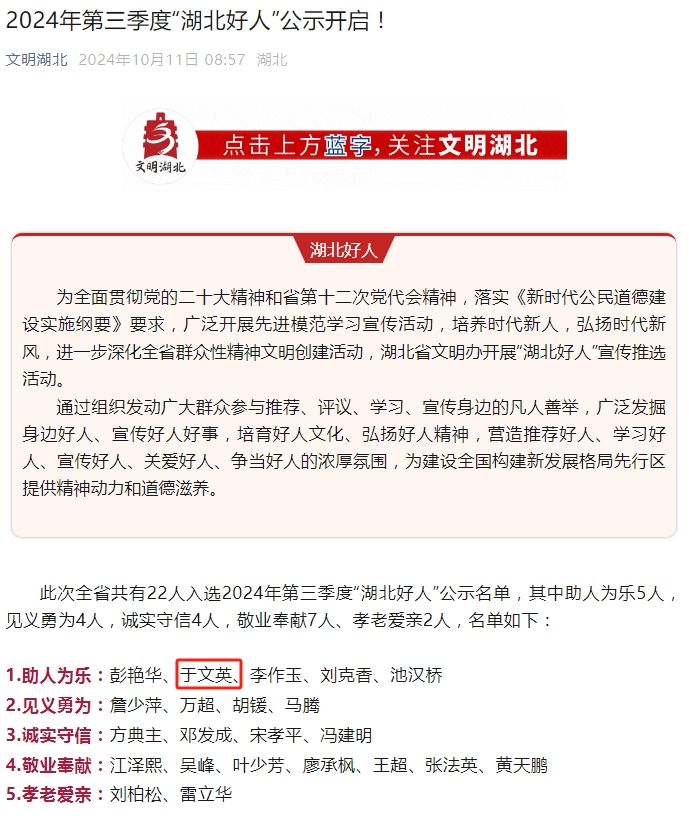 荊楚網(wǎng)(湖北日?qǐng)?bào)網(wǎng))訊(記者呂鑒蕾 通訊員黃旺宣、華文莉)10月11日,2024年第三季度“湖北好人”公示開(kāi)啟,全省共有22人入選公示名單。其中,“鑰匙姑娘”于文英榜上有名。