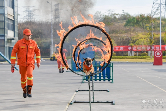 樓層綜合滅火演練前,現(xiàn)場先后開展了搜救犬綜合搜救操、繩索救援上升與下降操、綜合滅火救人操等科目。尤其是搜救犬互動表演,讓人驚嘆不已?!坝行覅⒓舆@次活動,還能‘?dāng)]’到搜救犬,近距離觀看到它們?nèi)绾斡?xùn)練、搜救,我很激動?!焙睅煼洞髮W(xué)文理學(xué)院消防志愿者王晨睿說。