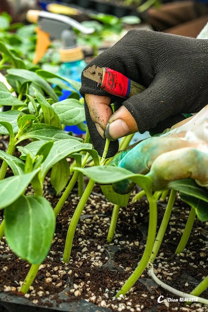 廣西 “女子嫁接隊” 帶頭人梁麗麗率姐妹去年12月底扎根基地開展嫁接。只見她熟練地掐掉瓜芯,用專業(yè)的自制刀具斜切掉西瓜接穗苗的根部,再迅速將其插入頂端葫蘆砧木,整個過程行云流水,不到6秒就能完成一株西瓜苗的嫁接。她表示:“我們是12月25日過來的,一共11個姐妹,每天嫁接6萬株,150萬株西瓜苗能在春節(jié)前全部嫁接完成?!?/p>