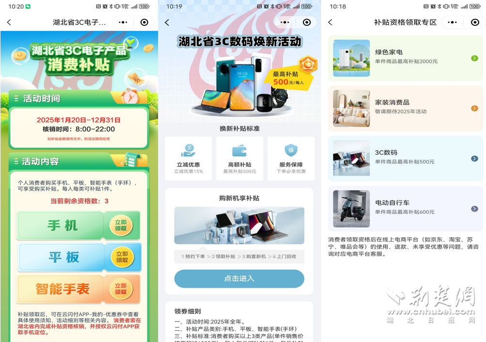 荊楚網(wǎng)(湖北日?qǐng)?bào)網(wǎng))訊 (通訊員 高洋)2025年1月20日,“國(guó)補(bǔ)”政策首次擴(kuò)圍至消費(fèi)電子行業(yè)。對(duì)個(gè)人消費(fèi)者購(gòu)買華為手機(jī)、平板、智能手表手環(huán)等3類數(shù)碼產(chǎn)品(單件銷售價(jià)格不超過(guò)6000元),按產(chǎn)品銷售價(jià)格的15%給予補(bǔ)貼,每位消費(fèi)者每類產(chǎn)品可補(bǔ)貼1件,每件補(bǔ)貼不超過(guò)500元。對(duì)于想要購(gòu)買華為手機(jī)的消費(fèi)者來(lái)說(shuō),這波優(yōu)惠力度拉滿。