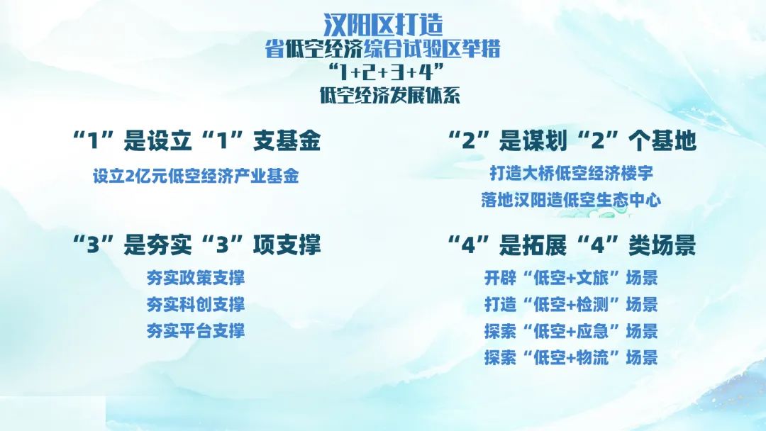 △漢陽區(qū)發(fā)布打造省低空經(jīng)濟(jì)綜合試驗(yàn)區(qū)舉措,構(gòu)建“1+2+3+4”的低空經(jīng)濟(jì)發(fā)展體系。