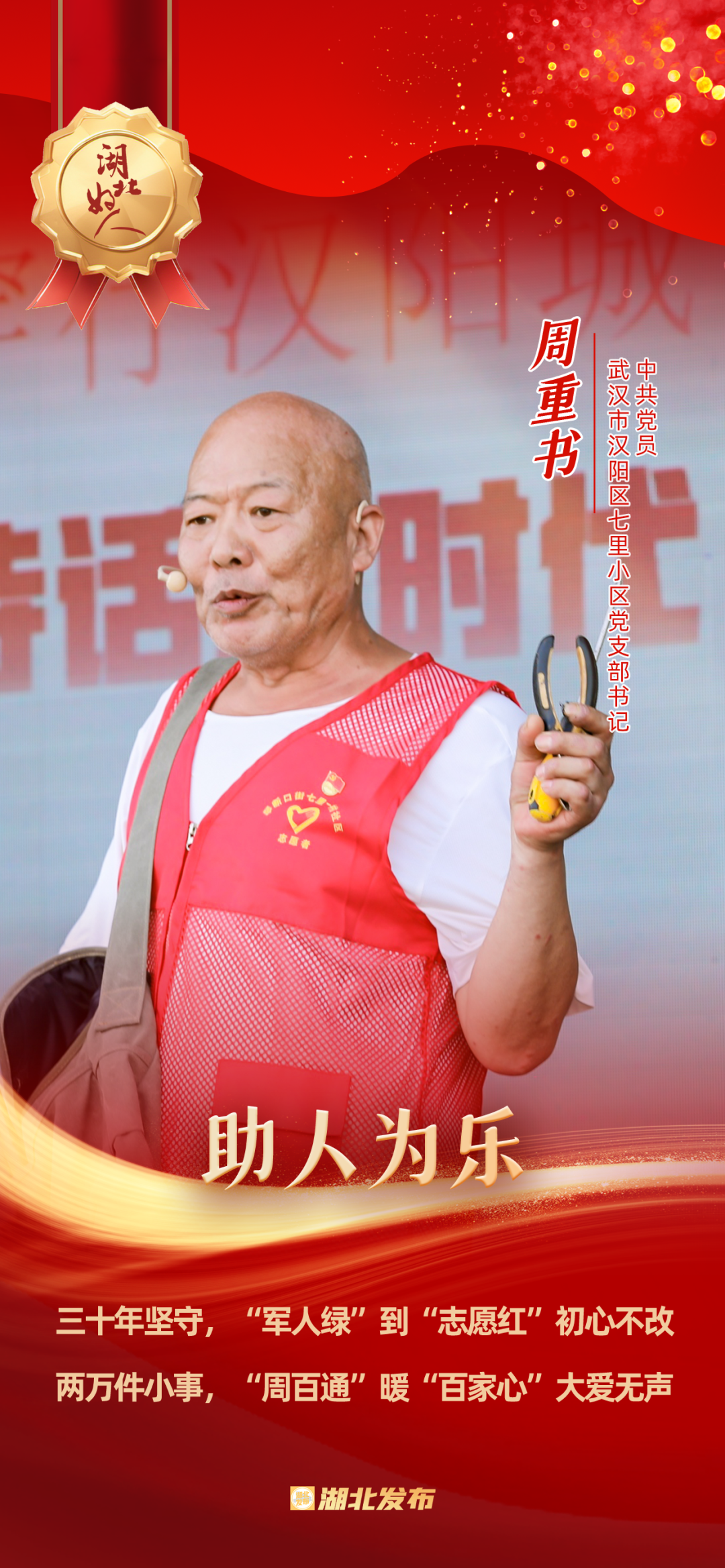 1973年在部隊(duì)入黨,1976年轉(zhuǎn)業(yè)到武漢家具廠,2009年被選為社區(qū)黨委委員,2023年榮獲“武漢楷?!狈Q號……今年75歲的周重書是一名退伍老黨員,在部隊(duì)曾兩次榮立三等功,在工廠也多次被評為先進(jìn)工作者和模范標(biāo)兵。