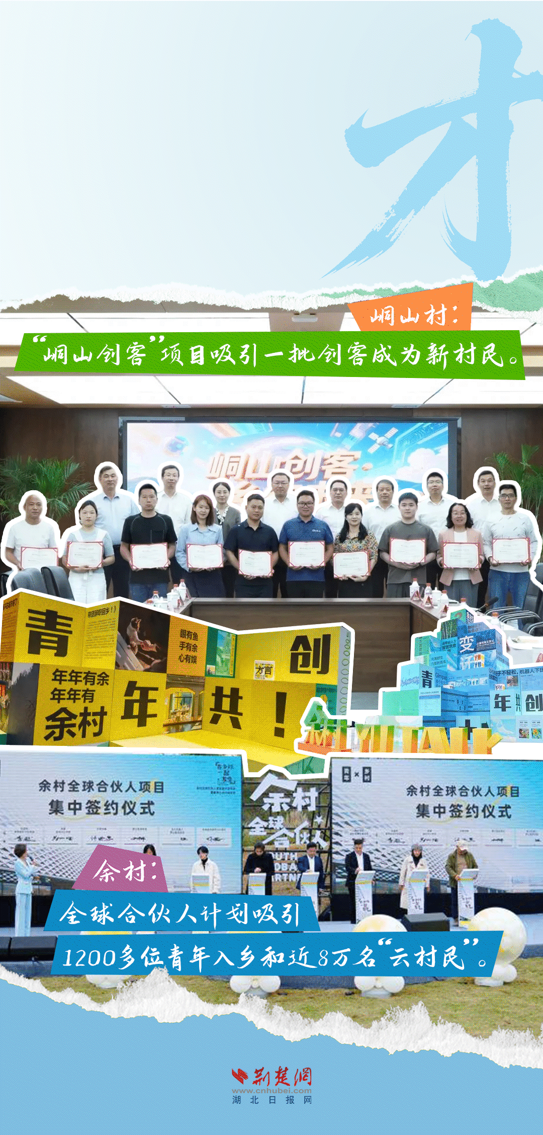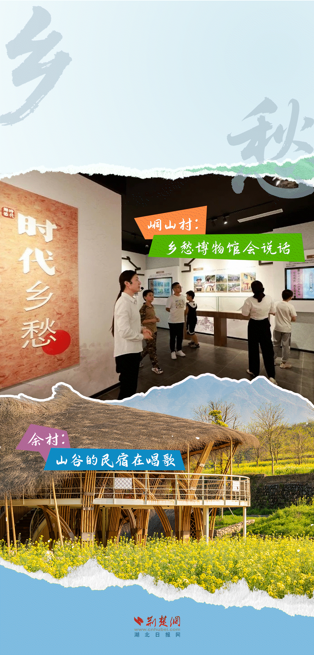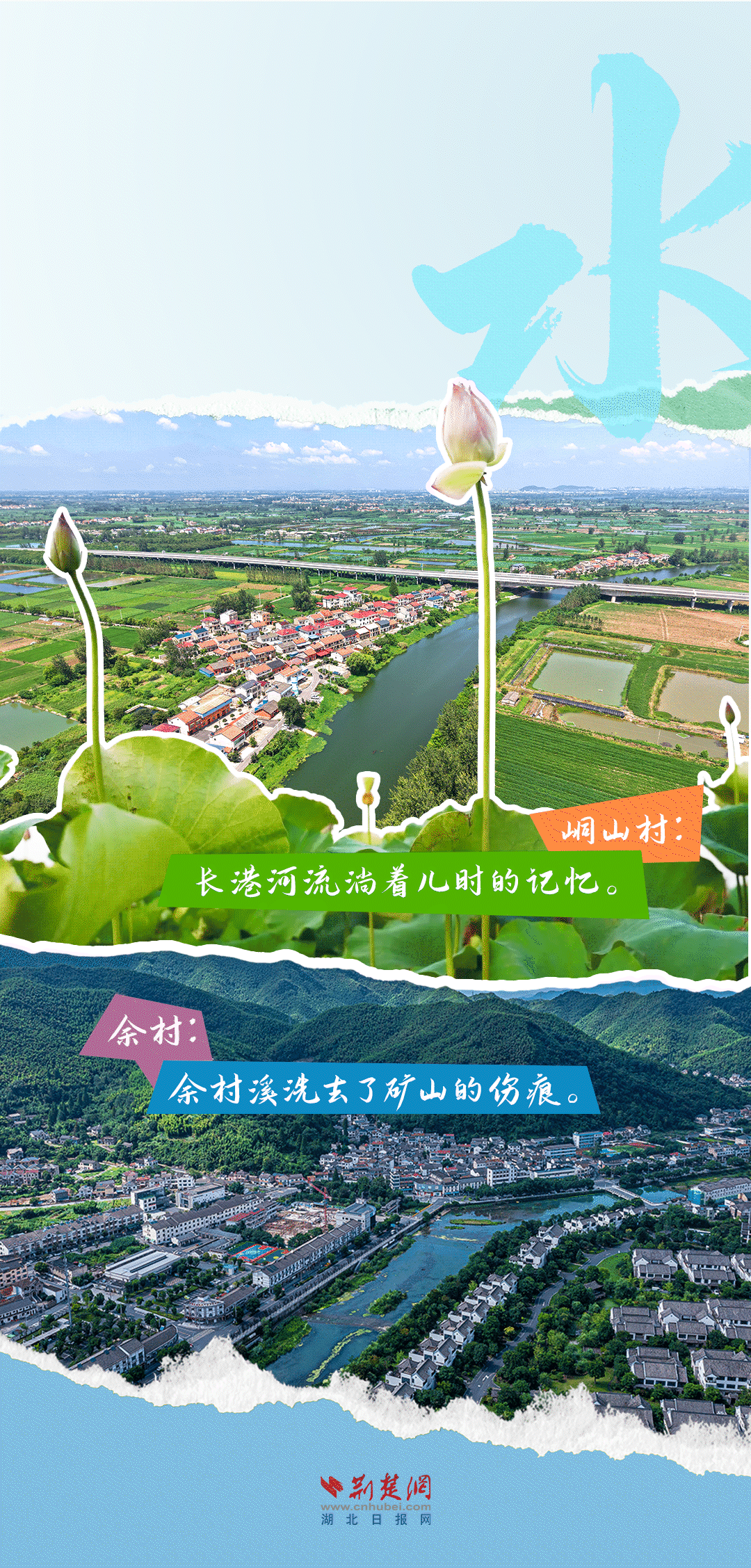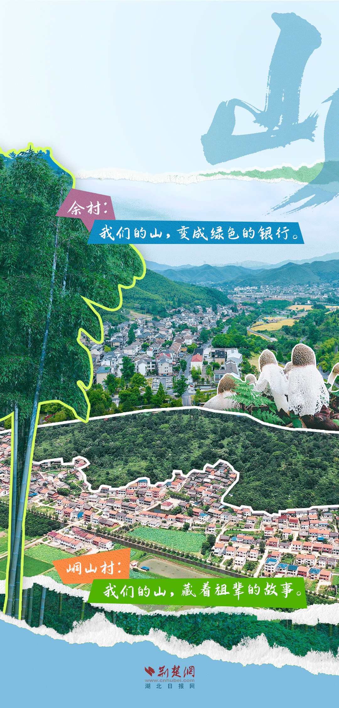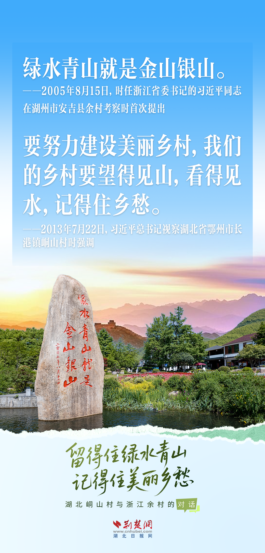 今天,荊楚網(wǎng)(湖北日?qǐng)?bào)網(wǎng))推出創(chuàng)意海報(bào)《留得住綠水青山,記得住美麗鄉(xiāng)愁——湖北峒山村與浙江余村的對(duì)話》,展示中國(guó)鄉(xiāng)村的美麗畫(huà)卷。