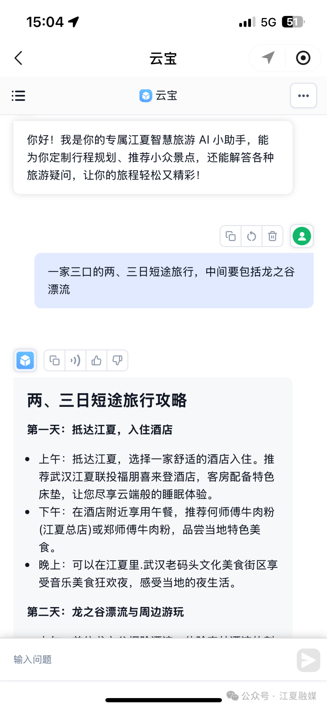 今年5月,基于騰訊元寶大模型,“云游江夏”小程序上線一款獨(dú)家AI——云寶,通過智能化技術(shù)全面升級游客體驗(yàn),同時為景區(qū)管理注入數(shù)字化活力。借助AI智能導(dǎo)游和個性化推薦功能,游客可享受定制化行程規(guī)劃;同時,AI即時應(yīng)答服務(wù)則能快速解決如查找景區(qū)信息等實(shí)用問題,大幅提升出游便利性。