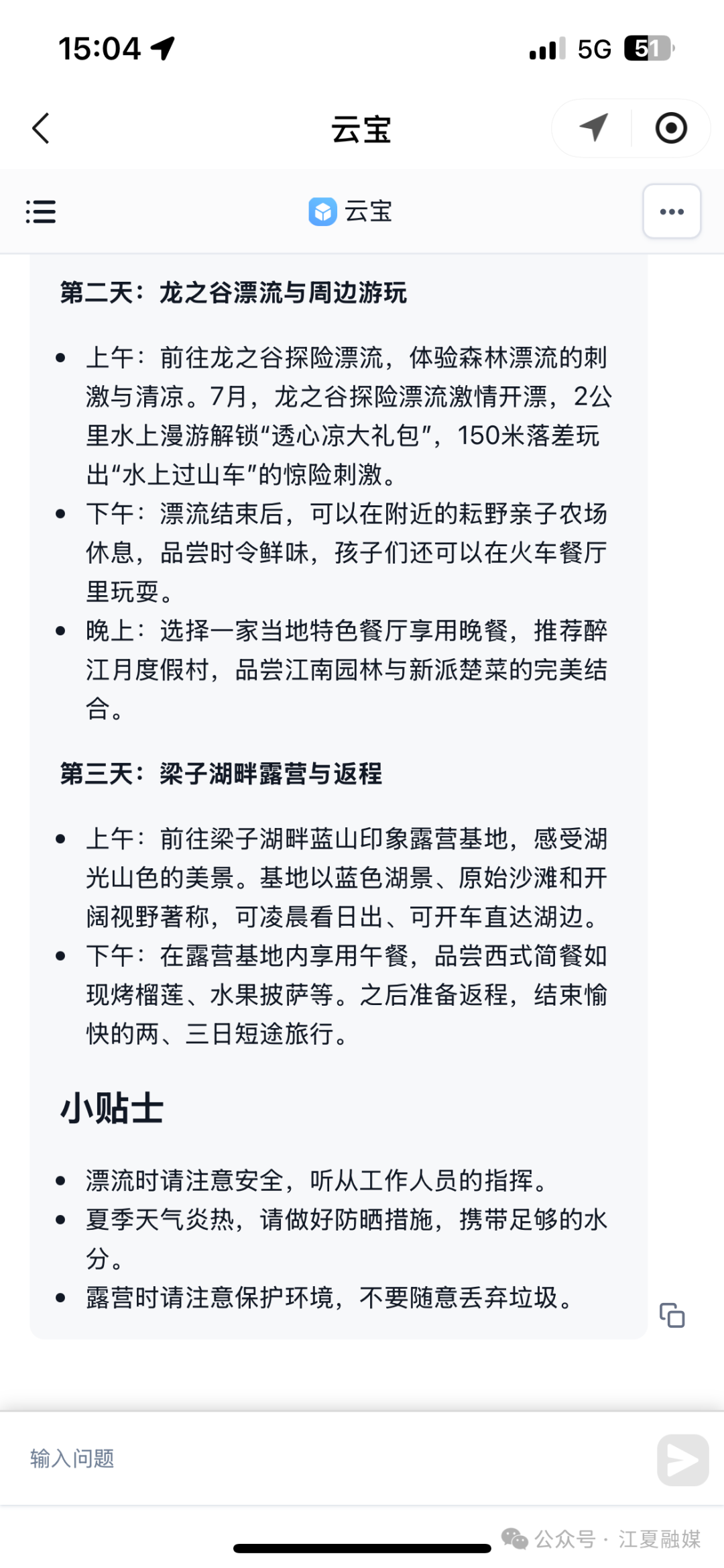 荊楚網(wǎng)(湖北日報網(wǎng))訊 (通訊員 王夫之)暑假臨近結(jié)束,不少家庭都在計劃一場既能避暑又適合親子互動的旅行,但面對眾多目的地和繁雜的信息,想要規(guī)劃出一條貼合自家需求的完美路線,是不是常常讓人犯難,別擔(dān)心,AI云寶來幫忙!