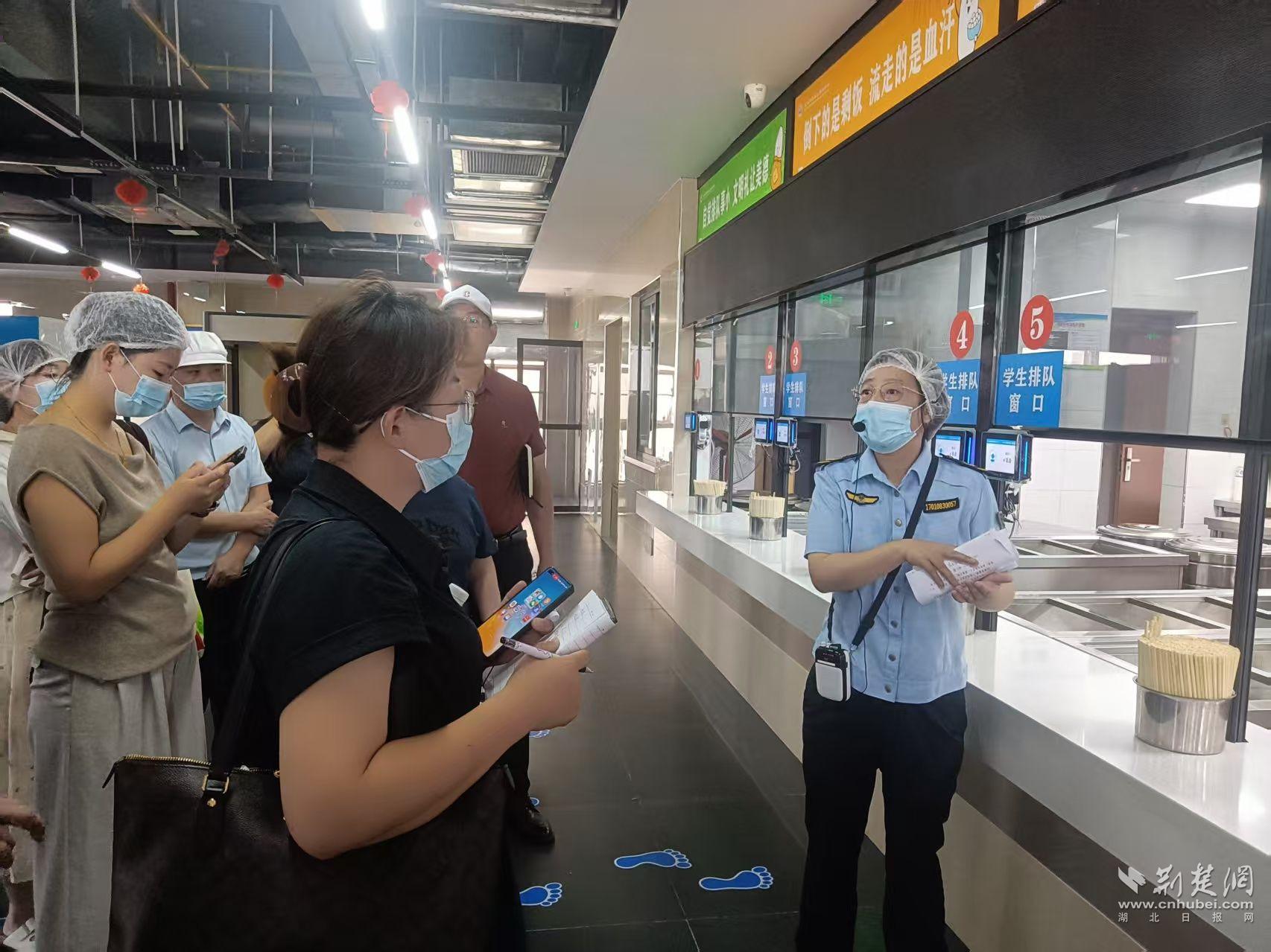 吳家山第四中學食堂內(nèi),工作人員正忙碌著為軍訓學生做午餐。東西湖區(qū)市場監(jiān)管局餐飲科執(zhí)法人員帶領與會人員一邊實地觀摩,一邊現(xiàn)場授課。