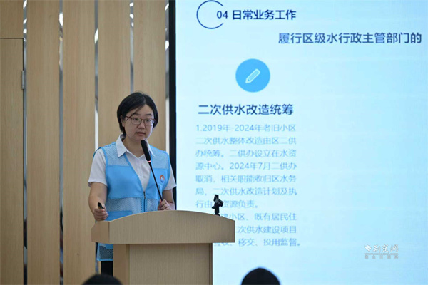 活動開場,武昌區(qū)水資源管理服務(wù)中心主任周妍圍繞《武昌區(qū)水務(wù)和湖泊局及水資源管理中心工作職責(zé)》展開解讀,清晰梳理水務(wù)部門在水資源調(diào)配、供水保障、設(shè)施維護(hù)等方面的職能;同時深入講解二次供水改造及修繕現(xiàn)行政策,從改造標(biāo)準(zhǔn)、申請流程到惠民福利逐一剖析,讓居民明晰這項民生舉措。