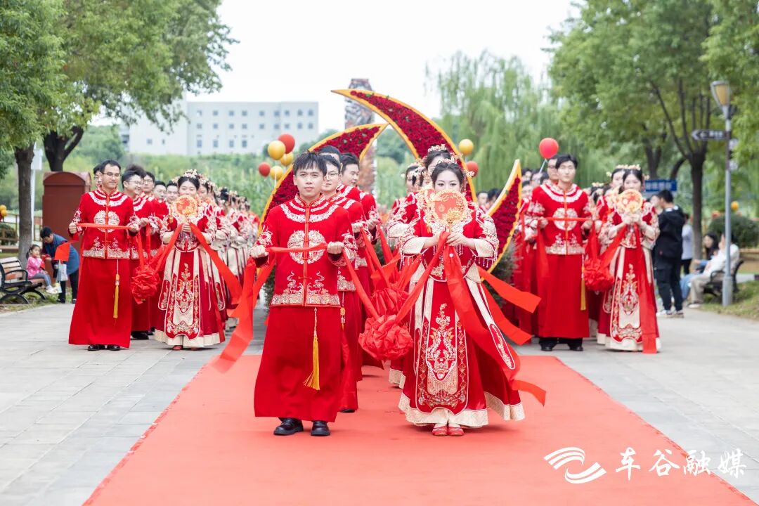 上午9點(diǎn)40分,以嵐圖夢(mèng)想家為頭車(chē),42輛嵐圖知音組成的迎親車(chē)隊(duì)緩緩駛?cè)霚幕瘜m。9點(diǎn)58分,新人們手牽紅繡球,共同跨越“幸福之門(mén)”,集體婚禮正式拉開(kāi)帷幕。儀式上,新人們整裝正冠,行對(duì)拜禮、執(zhí)手禮,新人代表領(lǐng)誦婚書(shū)、展示才藝,溫馨而熱烈的氛圍感染了在場(chǎng)的每一位嘉賓。