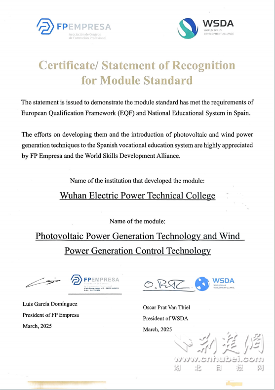 據(jù)了解此次是國(guó)內(nèi)電力類(lèi)高職院校首次實(shí)現(xiàn)電力課程標(biāo)準(zhǔn)向歐洲國(guó)家的輸出,其價(jià)值不僅在于深化中西兩國(guó)在可再生能源職教領(lǐng)域的合作交流,更關(guān)鍵的是為中國(guó)電力技術(shù)“走出去”戰(zhàn)略提供了配套的技能人才培訓(xùn)支撐,為國(guó)際電力產(chǎn)能合作量身打造出可復(fù)制、可推廣的“武漢電力職教方案”。