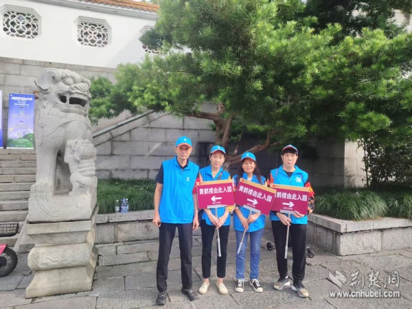 西廠口社區(qū)“市民園長”志愿團(tuán)隊在黃鶴樓景區(qū)開展文明引導(dǎo)與旅游咨詢。 通訊員供圖