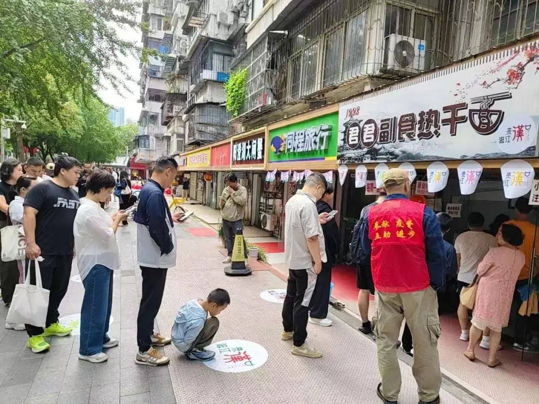 國(guó)慶中秋假期,江漢區(qū)游客量激增,君君副食的隊(duì)伍從店門(mén)口蜿蜒著排出數(shù)十米。社區(qū)志愿者舉著醒目的提示牌引導(dǎo)停車(chē),網(wǎng)格員把路邊的共享單車(chē)統(tǒng)一移走,引導(dǎo)著慕名而來(lái)的食客井然有序地排隊(duì)等候。“以前一到節(jié)假日就發(fā)愁,客人擠得轉(zhuǎn)不開(kāi)身,現(xiàn)在有專(zhuān)人維持秩序,生意反而更穩(wěn)當(dāng)了?!钡曛饔喟⒁滩林~頭的汗笑言。