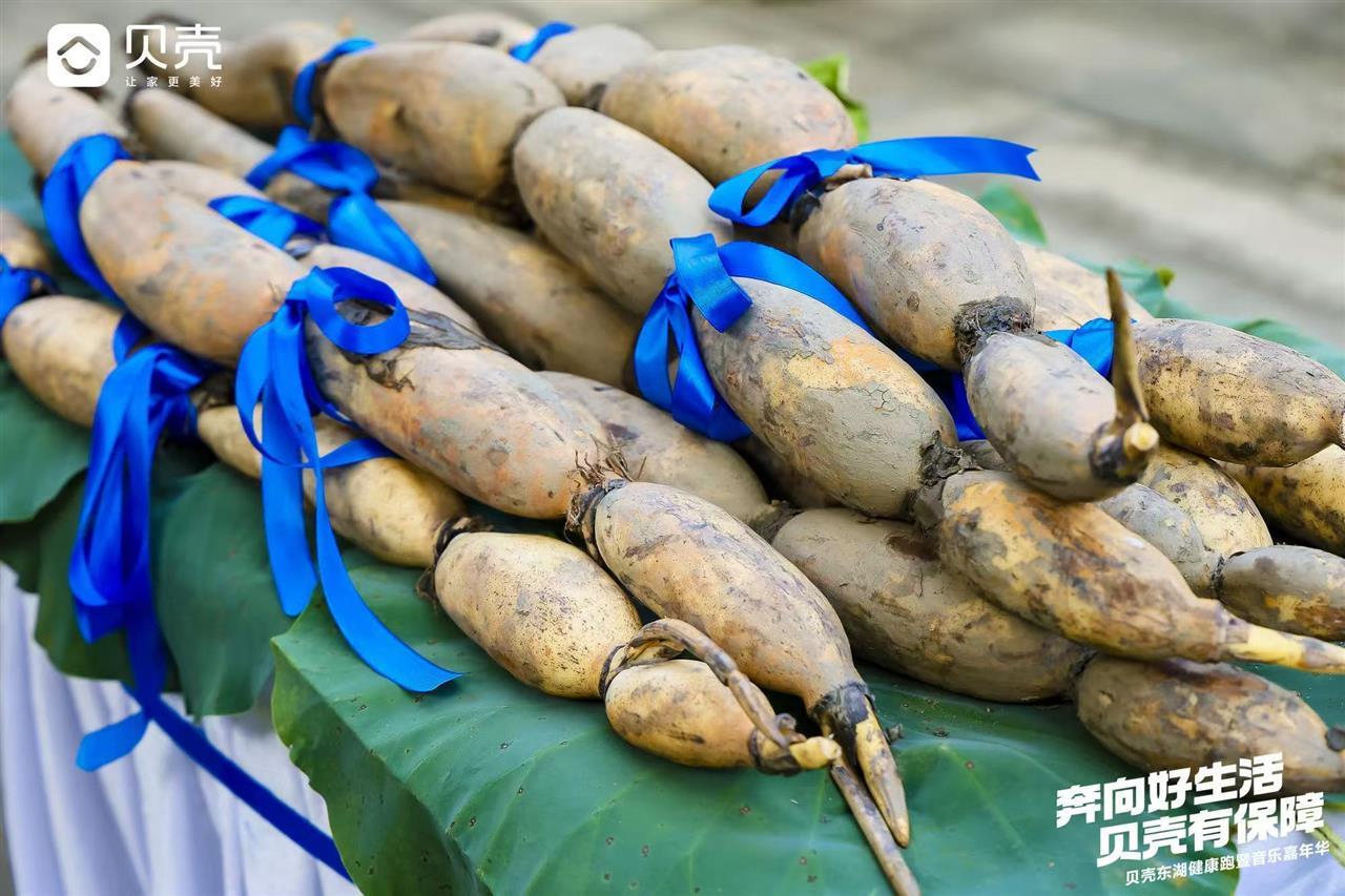 有趣的是,本次比賽為前三名選手準(zhǔn)備了迪卡儂山地自行車、王一博同款SKG腰部按摩儀器、Artsmith筋膜槍深層肌肉按摩器外,還向他們特別贈(zèng)送了1根長(zhǎng)約1.6米的蓮藕。這也是當(dāng)天剛從藕塘里挖出的新鮮野藕。這一充滿特色的獎(jiǎng)品,寓意著“跑在東湖,暖在胃里”,讓跑友們?cè)谙硎苓\(yùn)動(dòng)快樂(lè)的同時(shí),也能感受到濃濃的江城風(fēng)味。