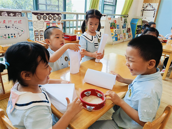 動(dòng)手環(huán)節(jié)點(diǎn)燃孩子們的熱情,四人一組的小隊(duì)伍里,小朋友們手握A4紙、膠帶躍躍欲試,有的反復(fù)卷緊紙張,力求讓紙筒更厚實(shí);有的湊著腦袋和伙伴商量,給紙筒底部貼“小支架”增強(qiáng)穩(wěn)定性。課堂里,剪刀裁剪聲、膠帶粘貼聲伴著小聲討論,專(zhuān)注的小身影構(gòu)成了熱鬧又溫馨的畫(huà)面。