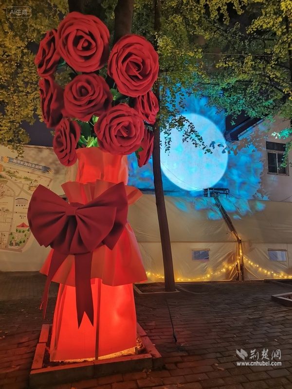 荊楚網(湖北日報網)訊(通訊員 陳曉燕 周佳穎)11月5日,武昌區(qū)黃鶴樓街道后宰門街角一道獨特的風景引人注目,一棵“永不凋零”的“愛之樹”絢麗綻放,樹上盛開的巨型玫瑰花與一旁的月球投影裝置相映成趣,與遠方的黃鶴樓共同構成一幅詩意城市景觀。