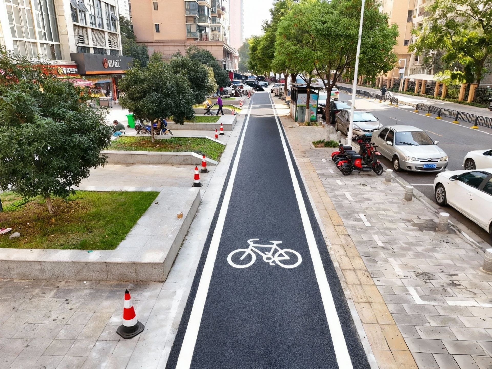 路面平整之后,還劃上了清晰的非機動車道標線,人車分流,騎行、步行互不干擾。同時,為了防止機動車占道,沿線還加設了8處阻車樁,機動車再也不能“霸占”人行道了。