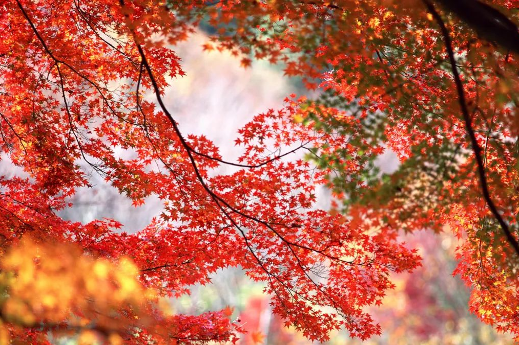 綿延的山谷像打翻的調(diào)色盤,紅色是主調(diào),其間點(diǎn)綴著金、橙和綠色,錯(cuò)落有致,構(gòu)成一幅溫暖的秋景長卷。