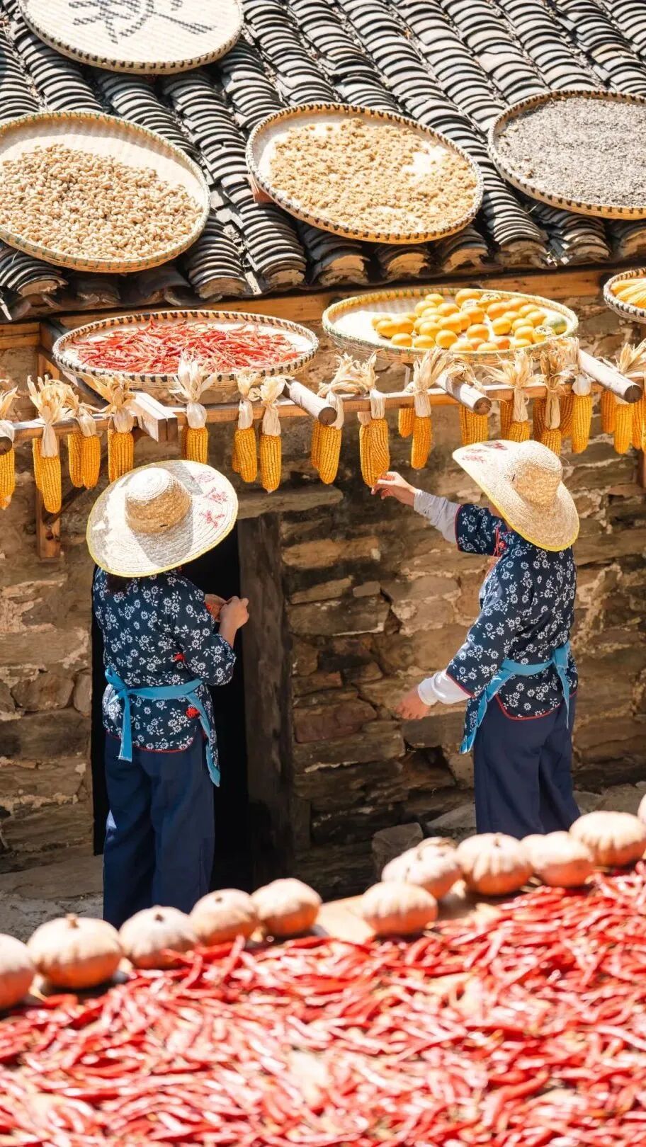 這不是擺設(shè)或表演,是真實(shí)的生活場景。家家戶戶門口擺放的竹匾里,晾曬的是他們一年勞作的收獲。