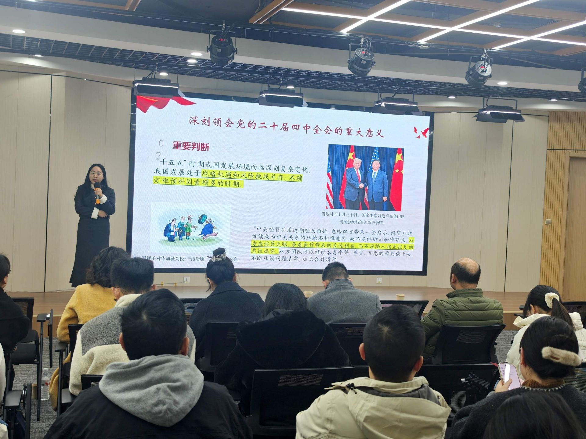 隨后,武漢市委黨校行政管理教研部教師、武漢市“青聲紅語”青年宣講隊成員吳靜怡,圍繞全會的重大意義與“十五五”時期的目標(biāo)任務(wù)作了專題輔導(dǎo)。她勉勵在場青年將個人理想融入國家發(fā)展大局,在科技創(chuàng)新、鄉(xiāng)村振興、基層治理等一線主戰(zhàn)場挺膺擔(dān)當(dāng),以實干實績?yōu)橹袊浆F(xiàn)代化貢獻青春力量。